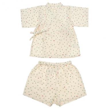 愛くるしいプリントを散りばめた、ボトムスとトップスがセットになった甚平オールです。オーガニックコットンの生地によるやさしい肌当たりが魅力。前を合わせて紐で結ぶデザインははだけにくいので、動き回る赤ちゃんにぴったり♪