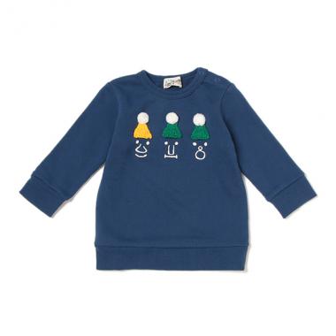 ボン天つきのニット帽をかぶった仲良し3人組のプリントトレーナーです。その場の雰囲気まで楽しくしてくれそうな茶目っ気たっぷりのアイテム♪ 適度な厚みの裏毛素材で、シャツをインしたりアウターを羽織ったりとマルチに活躍します。※80、90サイズのみ肩開き