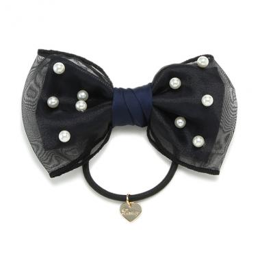 透け感のあるシフォン素材でふんわりと仕上げたポニーです。パール調ビーズを贅沢にちりばめてリッチ感アップ♪ ロゴ入りプレートがきらりと輝き、ブランドもさり気なくアピールできます。特別な日のコーデに加えれば、女の子らしくエレガントにきまりそうです。