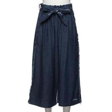 ロゴ入りベルトがポイントとなったワイドパンツです。サイドにフリンジをあしらってこなれ感たっぷりのルックスに仕上げました! 裾にも刺しゅうをトッピング。いつものカジュアルスタイルをオシャレにブラッシュアップしてくれる1本です。※ドローストリングでウエスト調節可能・モデルサイズ163cm・着用サイズ160cm
