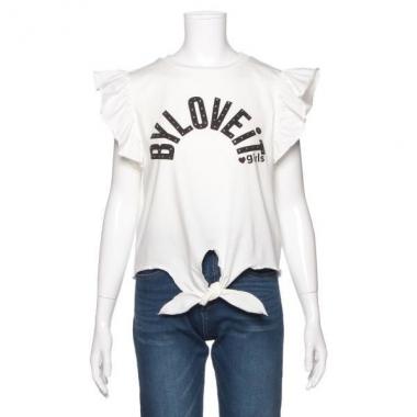 ストーンつきのロゴがブランドをリッチに印象づける前結びタンクトップです。アームホールへフリルをあしらい、女の子らしい甘い雰囲気に仕上げたアイテム♪ 裾リボンはほどける仕様なのでお好みに調整できます。※ボトムスは参考商品です・モデルサイズ159cm・着用サイズ160cm