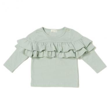 どこか大人っぽさを感じるカラーリングがおしゃれなTシャツです。身頃を横ぎるフリル重ねがボリューミーでスタイルのいいアクセント。肌に優しいコットン素材を採用しており、着心地も◎。内側にはお名前を記入できるタグつきです。※80、90サイズのみ肩開き