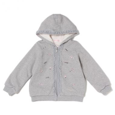 フロントにキャンディー刺しゅうをちりばめた、ポップでキュートなジップアップパーカーです。チュールフリルやハートチャームなど、女の子が心ときめくディテールをたっぷり詰め込みました。ふんわりとした肌触りの裏ボアは配色を変えてアクセントに。便利な両側ポケットつきです。