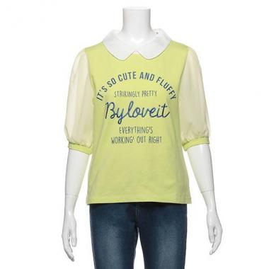 配色の衿をあしらいカジュアルながらもお上品な印象に仕上げたTシャツです。透け感のある生地で切り替えた、ふんわりパフスリーブが女の子らしさを惹き立てます♪ フロントのロゴ刺しゅうでブランドアピールもバッチリ。※ボトムスは参考商品です