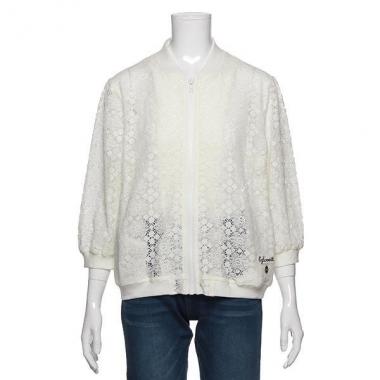 透け感のある風合いで軽やかに着こなせるニットレースブルゾンです。裾へロゴモチーフやメタルプレートをあしらい、ブランドらしいアクセントを効かせたアイテム♪ フチの部分はリブで切り替え、メリハリ良く仕上げました。両側ポケットつき。※ボトムスは参考商品です
