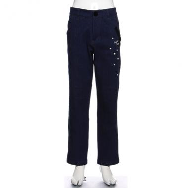 パール調パーツがちりばめられた、乙女心にぴったりのデニムパンツです。すっきりとしたシルエットのロング丈は、裾をロールアップしても◎。ベロア地のリボン&トップボタンやロゴ刺しゅうなど、こだわりがいっぱい詰まった一本です。ウエストは、アジャスターゴムでサイズ調節可能。