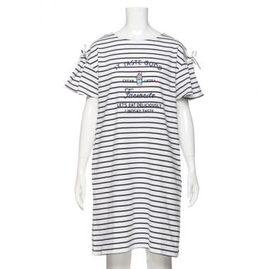 横へ広がるスリーブが女の子らしいワンピースです。肩リボンがキュートなポイント♪ 一枚でさらっと着こなせる手軽さも魅力です。両側にはポケットつき。オフホワイトはボーダー柄、紺は無地とカラーによってパターンが異なります。