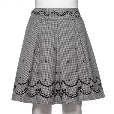 柄地にフロッキープリントをほどこしたスカートです。エレガントな印象をプラスする波形やドット風デザインで一味違ったコーデを楽しめます。右側にはポケットつき。ウエストはアジャスターゴムでサイズ調整が可能です。カラーによってチェックのパターンが異なります。