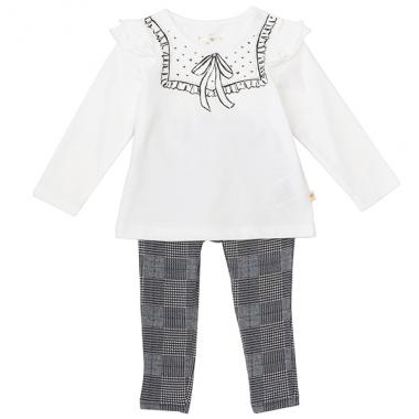 トロンプルイユプリントのTシャツとチェック柄レギンスのセットアップ。Tシャツは肩の部分にラッフルディテールをプラスし、よりガーリーなルックスに仕上げました。レギンスのクラシカルなグレンチェック柄も大人っぽさを印象づけるポイント。肩ボタンつき、レギンスのウエストはゴム仕様です。