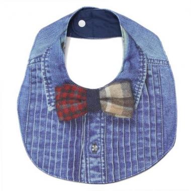 リアル感たっぷりな転写スタイです。まるでデニムシャツに蝶ネクタイをしているようなおしゃれなデザイン。首周りはスナップボタンで2段階まで調整ができます。なめらかな表面にお手入れが簡単なコットン素材を採用した、デイリーにもおすすめのアイテムです。