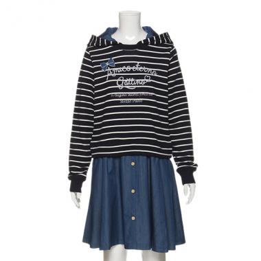 裏毛パーカーとボタン開きスカートを合わせたような、コーディネート風のドッキングワンピースです。カジュアルムードを盛り上げるフードは、お好みで取り外せる仕様♪ アイボリーは無地×チェック柄、紺はボーダー×無地の組み合わせです。※両側ポケットつき