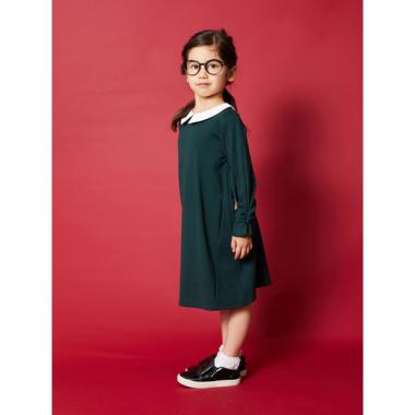 明るい色合いの衿をあしらった、清潔感のあるワンピースです。くしゅくしゅと愛らしく仕上げた袖口や、ボタン開きのバックネックがポイント♪ ソフトなポンチ生地を採用しており、着心地も良好です。両側にポケット、内側にはお名前を記入できるタグがついています。