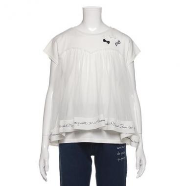 空気を含んで軽やかな動きを見せる、チュールをつけたTシャツです。チュールには、ぐるりとついた裾テープが重りになって程よいシルエットに仕上げています。小さいリボンをつけたりと甘さを感じるデザインでも、落ち着いたカラーを使用しているので全体にシックな印象です。※ボトムは参考商品です