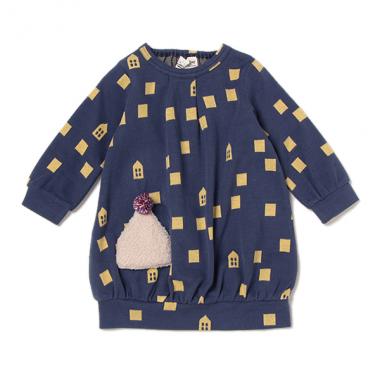 モダンで愛らしいキューブ柄のワンピースです。オリジナリティーあふれるパターンで、オンリーワンのスタイルを狙えるアイテム♪ ふわふわなボアとポンポンを組み合わせた、フロントのキュートなポケットも目を引きます。