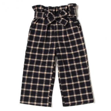 起毛感のある風合いで、秋冬シーズンに活躍するチェック柄パンツです。ワイドシルエットが力の抜けた雰囲気をただよわせるアイテム♪ フリル切り替えのウエストは、トップスの裾をインしてアピールするのがオススメ。ウエストのリボンはつけ外しができます。内側にはお名前を記入できるタグつきです。