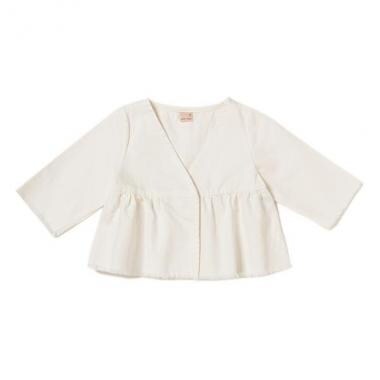 スッキリとしたVネックデザインで、大人っぽく仕上げたジャケットです。ギャザーフレアのふんわりとした切り替えに女の子らしさが薫るアイテム♪ 生地端をカットオフして、フリンジ状にデザインした袖口&裾もポイントです。