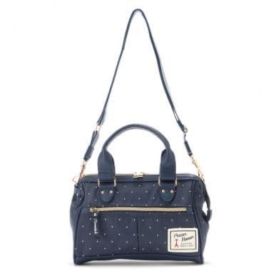 ボストンのように手持ちでも、ショルダーがけでも使える2WAYバッグです。開口部はがま口のように大きく開き、物の出し入れがスムーズ♪ 控えめなピンドットやゴールドに統一されたパーツなど、大人っぽいシックな印象にまとめました。お出かけに連れて行きたくなるオシャレなルックスです。
