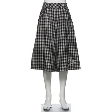 たっぷりゆとりをもったデザインがリラックスムードただようガウチョパンツです。ポケット口にほどこしたフリルがとってもチャーミング♪ 紺はデニム地、黒はチェックとカラーによってパターンが異なります。ウエストはアジャスターゴムでサイズ調整が可能。黒のみ裏地つきです。