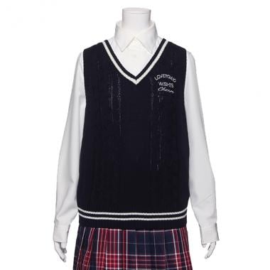 ライン入りのプレッピームードただようデザインで、卒服としても活躍するニットベストです。ケーブル柄の編地がやさしい印象を与えるアイテム♪ 洗濯機でのお洗濯が可能なので、お手入れもラクチンです。※インナーとボトムスは参考商品です