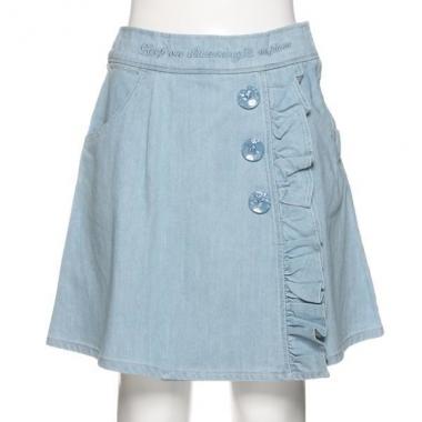 フリルやボタンで愛らしく飾った、ラップ風デザインのフレアスカパンです。サックスは無地、ライトブルーはストライプ柄と、カラーによって異なるパターンを採用しました。後ろの貝殻はパッチでポケットではありません。※アジャスターゴムでウエスト調節可能