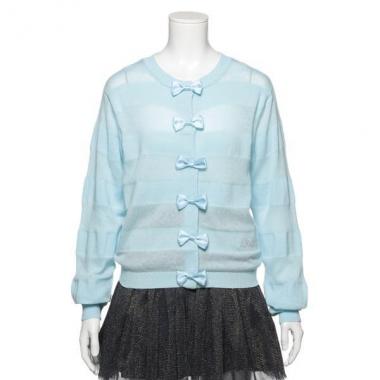 やや透け感のあるボーダーデザインで、軽やかに着こなせるカーディガンです。センターにツヤのあるリボンをずらりとあしらい、フェミニンかつ華やかな仕上がりに♪ サイドのさりげないロゴステッチもポイントです。※ボトムスは参考商品です