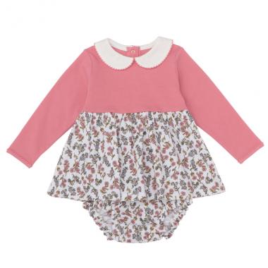 ガーリーなフラワープリントを採用したドレスとパンツのセット。ドレスには丸衿がついていて、ちょっとしたお出かけにもマッチする一枚に仕上がっています。コットン素材を使用した肌触りの良さも魅力のひとつ。ドレスは後ろボタン開き、ウエスト部分にゴム入り、パンツのウエストはゴム仕様です。