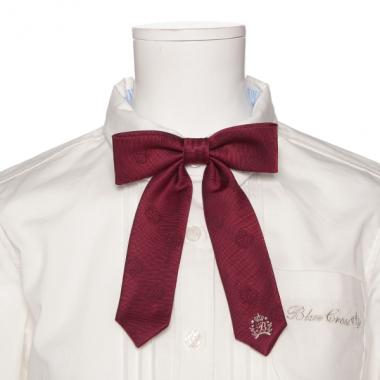 留め具でスムーズに装着できる便利なリボンタイです。エンブレム柄のジャカード生地は上品な光沢があり、フォーマルシーンにもぴったり。片方の先端には、ラメ糸によるワンポイント刺しゅうをほどこしました。首周りはゴム仕様で、アジャスターによる調節も可能です。※カラーによってパターンが異なります
