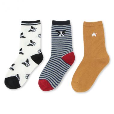 足元のおしゃれに活躍する3足組ソックスです。ブルちゃんをデザインしたものはキュートな表情をプラス。シンプルなデザインのスター刺しゅう入りのものはコーデのアクセントに。それぞれに良さを持った使用頻度も高くなること間違いなしのセットアイテムです。