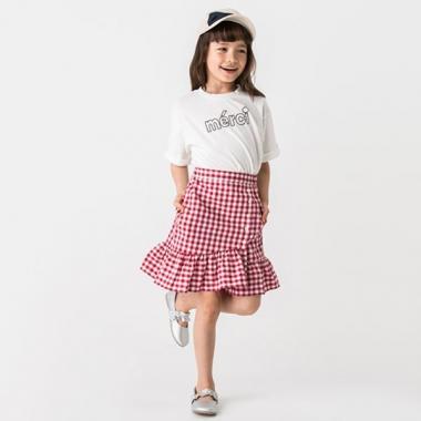 ギンガムチェック柄のガーリーなスカートです。サイドへボタンを配した、ラップ風のパターンメイクがポイント♪ 裾を幅広のフリルで切り替え、女の子らしさあふれるルックスに。シンプルなトップスを合わせるだけでかわいく決まります。両側ポケットつき。・モデルサイズ116cm・着用サイズ120cm