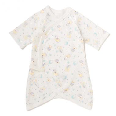 おでかけ着のインナーとしても使えるコンビ肌着です。足を動かしてもはだけない、うれしい股下スナップボタン仕様。前開きデザインで赤ちゃんが寝転がったままでも着脱できます。縫い目を表に出しているのでやさしい着心地です。