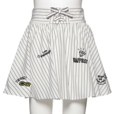 スカートをはいているようなデザインのフレアスカパンです。所々に配置した刺しゅうやワッペンがいいアクセント♪ オフホワイトはストライプ柄、カーキは迷彩柄、ブルーはデニム風と、カラーによって異なるパターンを採用しました。ウエストはアジャスターゴムでサイズ調節可能。右側にポケットつきです。