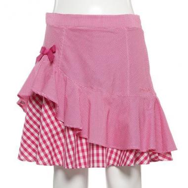 ふわふわと存在感のあるラッフル切り替えで、スタイルを女の子らしく演出するスカパンです。サイドへリボンを配した、アシンメトリーのデザインがポイント♪ 赤・黒はチェック柄、パープルは無地と、カラーによって異なるパターンを採用しました。※アジャスターゴムでウエスト調節可能・モデルサイズ162cm・着用サイズ150cm