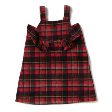 タテラインを意識したすっきりシルエットが大人っぽいジャンパースカートです。胸元に半円を描いたフリルがアクセントに♪ ウール混紡なのであたたかみある風合いです。少し派手な色合いのタイツと合わせてこなれ感を出すのもおすすめ。内側にはお名前を記入できるタグつきです。