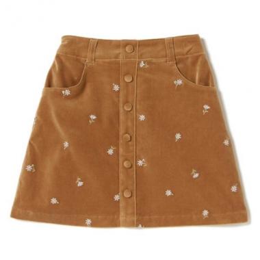 レトロな雰囲気の台形スカートです。ベロア調の生地感でやわらかな風合いを持ち、小花柄の刺しゅうがさりげなくアクセント。サイドファスナーやアジャスターゴムなどウエスト周りを考えた仕様が充実。丈が短いのでタイツやレギンスなど足元のスタイリングも楽しめます。※ジュニアサイズあり、品番:4973110