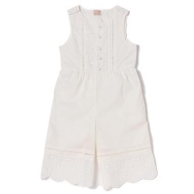 ナチュラル&ガーリーなムードをただよわせる、コットンレース仕立てのオールインワンです。要所のカットワーク刺しゅうがスタイルに抜け感をプラス♪ コロンとしたくるみボタンや、スカラップ形の裾など、ディテールも愛らしさあふれる仕上がりです。