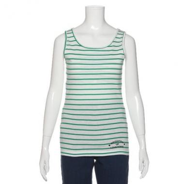 デイリーに活躍するベーシックなボーダー柄のタンクトップです。取り外し可能なインナーカップつきで、1枚でさらりと着られるのがうれしいポイント♪ 裾にはロゴを添えて、さり気なくブランドをアピールできます。※ボトムスは参考商品です