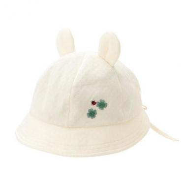 愛らしいクマの耳が付いた帽子です。てんとう虫とクローバーの刺しゅうをあしらい、シンプルなデザインにアクセントをプラス。肌当たりのやさしいオーガニックコットンの素材を使用。後ろのコードでサイズ調節もできます。あご紐付き。